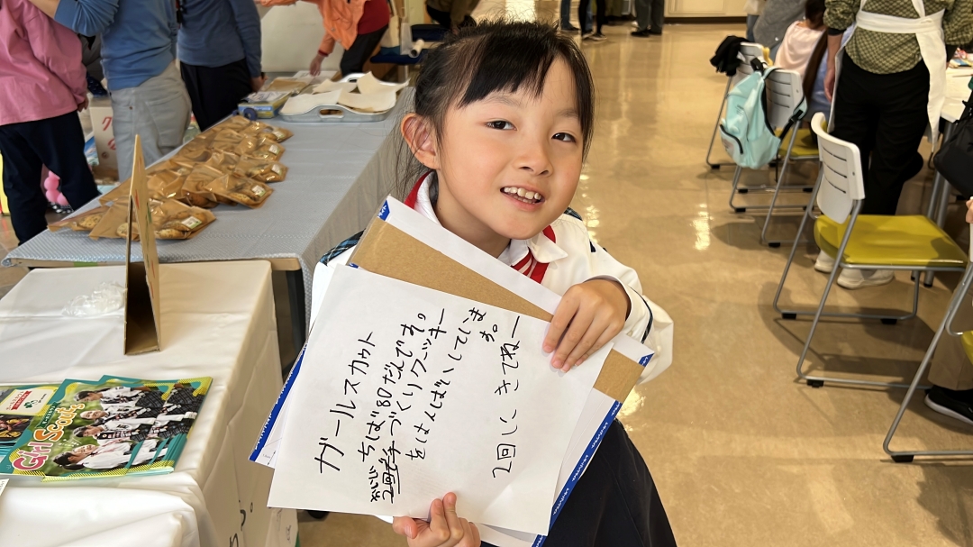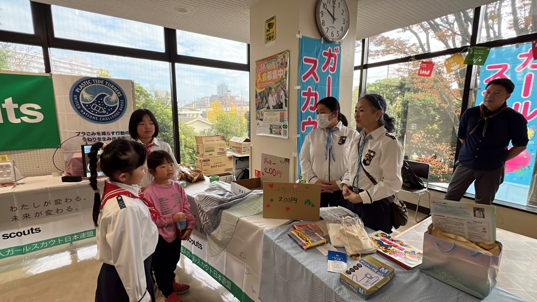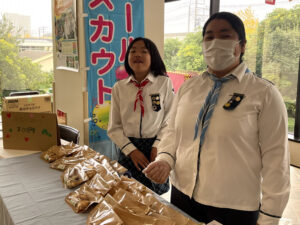 ブラウニー(小学低学年)部門やジュニア(小学高学年)部門のガールスカウトたちが、交代で担当。大きな声を出して接客に挑戦し、時には焼きたてのクッキーを袋詰めしたり、お客様とお金のやり取りをしたりしました。